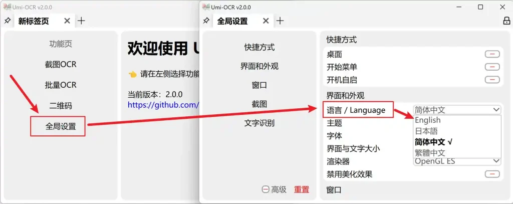Umi-OCR 支持的界面多国语言。在第一次打开软件时,将会按照你的电脑的系统设置,自动切换语言。 如果需要手动切换语言,请参考下图,全局设置→语言/Language 。