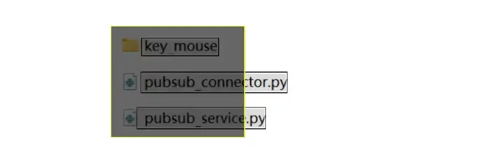 - 注意,只有处于忽略区域框内部的整个文本块(而不是单个字符)会被忽略。如下图所示,黄色边框的深色矩形是一个忽略区域。那么只有key_mouse才会被忽略。pubsub_connector.py、pubsub_service.py 这两个文本块得以保留。