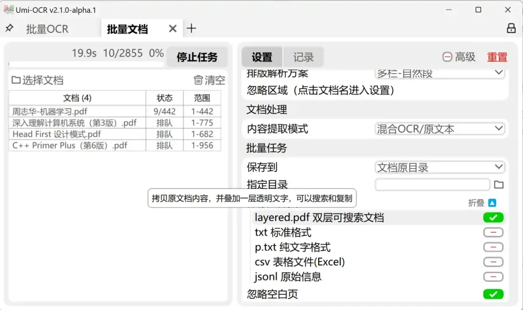 - 保存识别结果的支持格式:txt, jsonl, md, csv(Excel)。