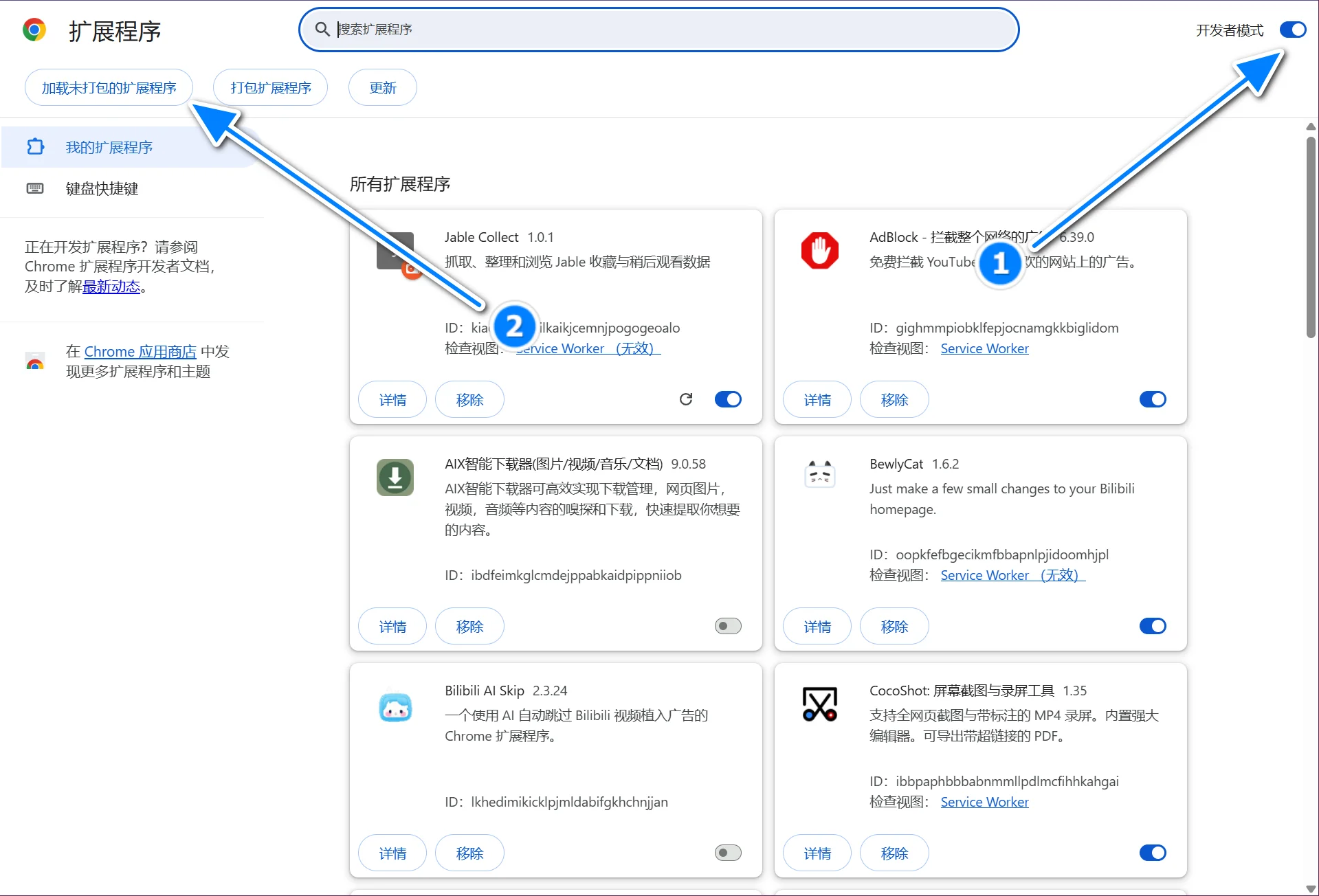 - 点击「加载已解压的扩展程序」,选择解压后的扩展文件夹,或者将文件夹拖动到扩展管理界面(参考图片说明)