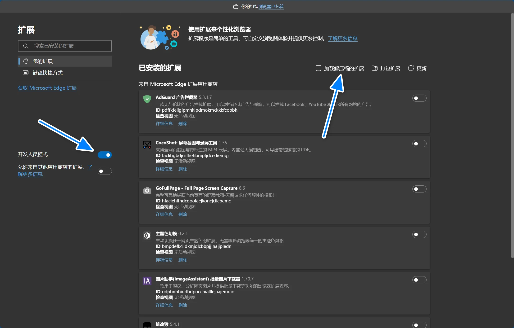 - 打开Edge浏览器(谷歌内核浏览器都支持),右上三个点 – 拓展 – 管理拓展 – 点开【开发者模式】