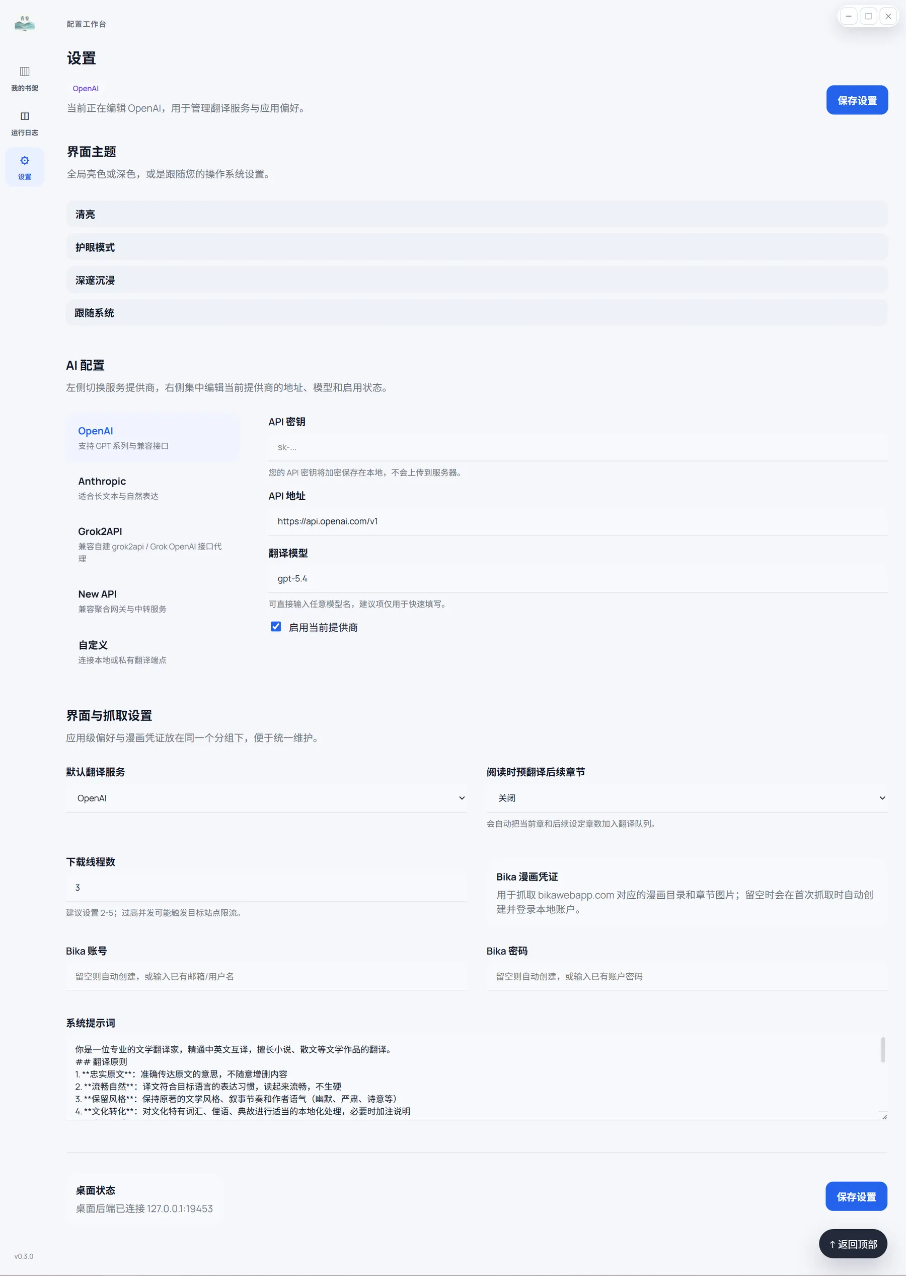 - 漫画翻译:后端内置 OpenAI 兼容图片编辑接口,直接输出翻译后图片与逐页译文,无需借助第三方工具,漫画翻译一体化完成。翻译目标语言可自由设置,软件自动识别原文语言,确保翻译精准度。