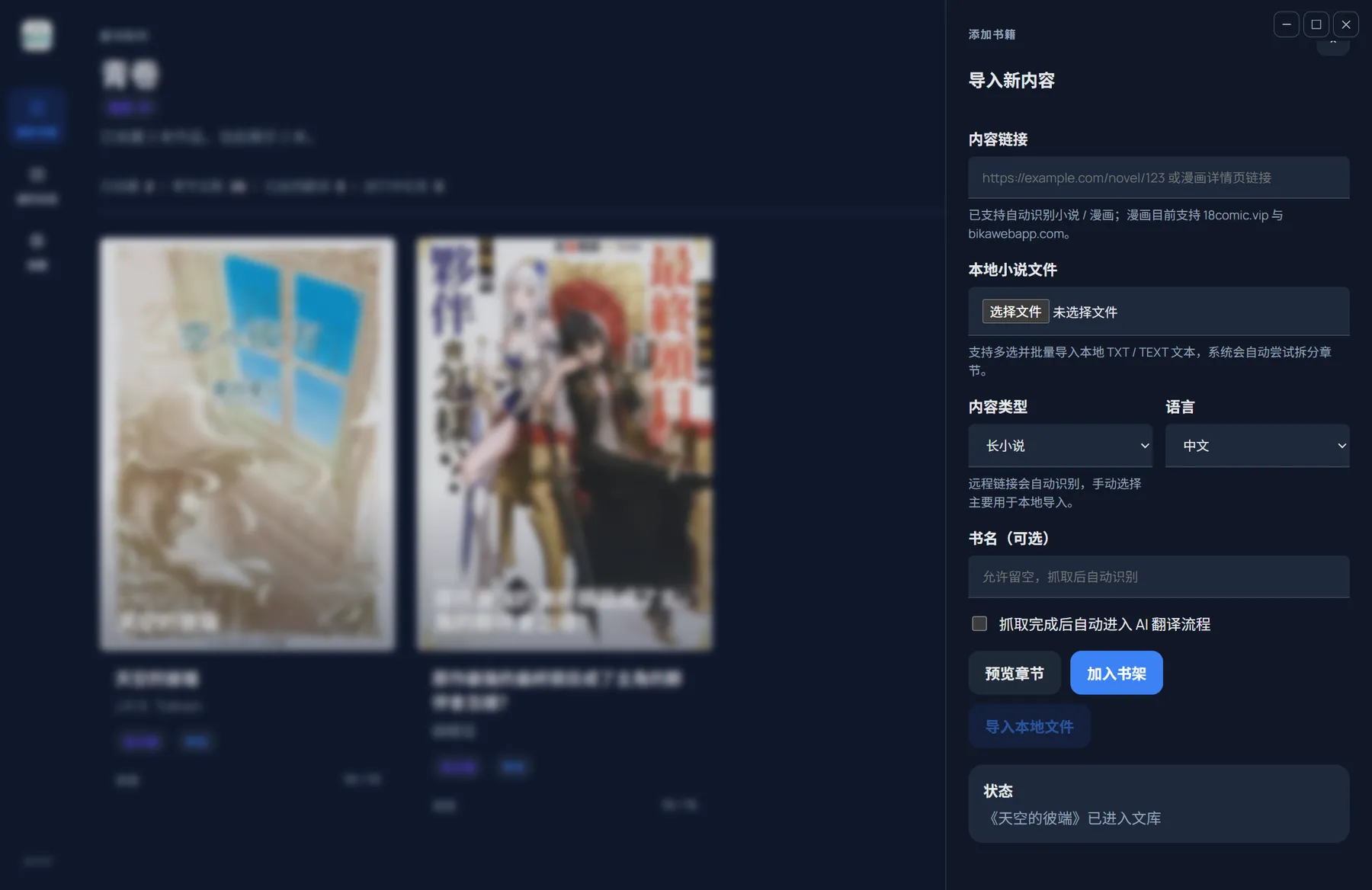它打破了传统阅读软件功能单一的局限,将网络内容抓取、本地文件管理、AI 智能翻译、沉浸式阅读等功能集于一身,以 “桌面内容集成中心” 为出发点,聚焦小说与漫画两大核心场景,无论是网络小说、外文漫画,还是本地 TXT、Markdown 文档,用户无需在多个软件间来回切换,一站式解决所有阅读难题,所有抓取、翻译后的内容均存储在本地 data 目录,不依赖云端服务器,既保障了用户数据隐私,又能实现离线流畅阅读,真正实现 “一个软件,搞定所有阅读需求”。