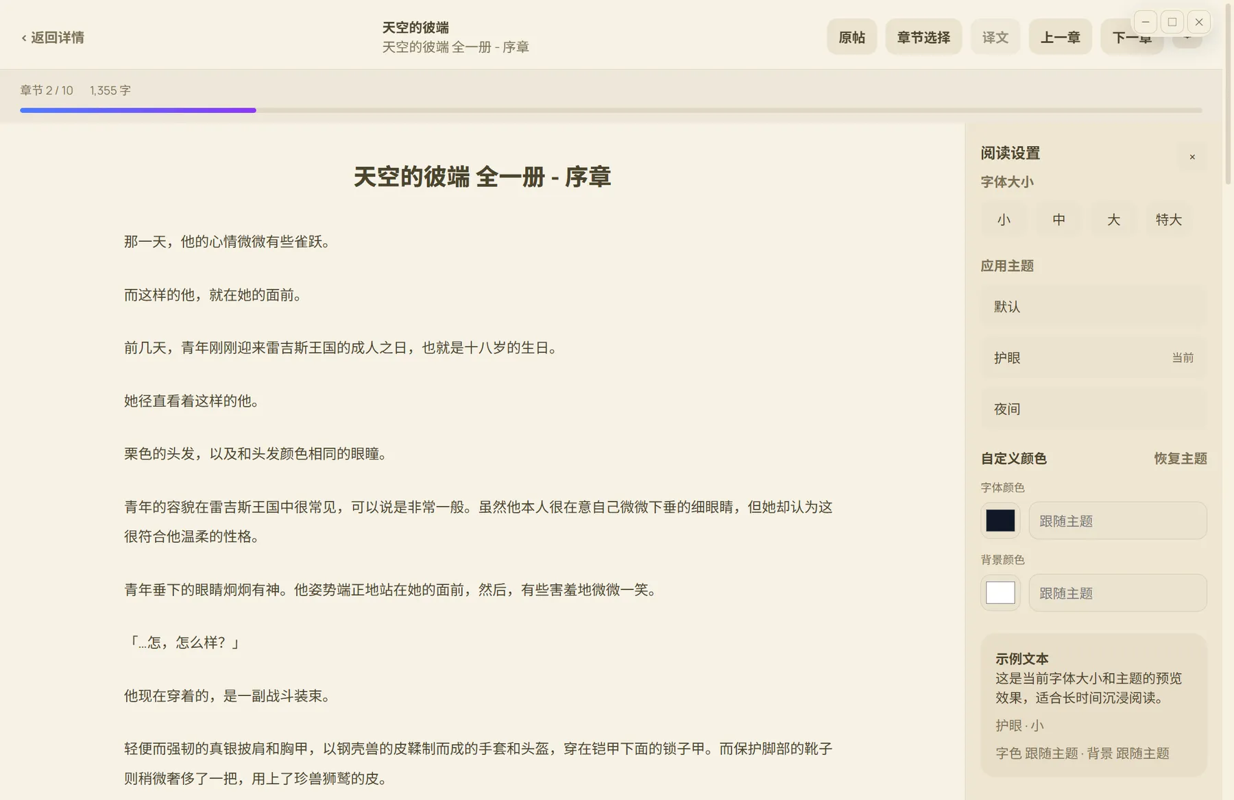 - 个性化界面设置:支持应用主题、阅读主题切换,包含默认、护眼、夜间、跟随系统等多种模式,适配不同光线环境;可自由调整字体大小、正文颜色、背景色,满足不同用户的视觉偏好。
